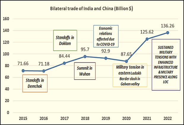 Sino-India relations indicate a rapid growth of bilateral trade over the last ten years despite conflicts between both countries. Notably, in 2015, when India and China clashed in Ladakh, the trade volume slightly increased from the preceding 2014 from US$70.59 to US$71.66 billion. Similarly, despite the Galwan clashes of 2020 and a significant military confrontation in the Galwan Valley of the Himalayas, the trade volume in 2021 continued to grow. It reached a record US$125 billion, a 43.3% increase from 2020. In 2022, China emerged as India's largest trading partner, with bilateral trade totalling US$136.26 billion. This development is a testament to the resilience of their economic relations, which seem to maintain stability despite escalating military tensions.