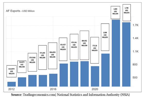 The economic sanctions imposed by the US, UN, and EU have exacerbated Afghanistan's economic woes, restricting its international trade. The US froze nearly US$9.5 billion of Afghanistan’s external reserves, leaving the Afghan central bank, Da Afghanistan Bank (DAB), asset-deprived and cut off from the global financial system. The World Bank estimated that Afghanistan's real GDP declined by approximately 26% in 2021 and 2022. Exports from Afghanistan decreased to US$1777.90 Million in 2023 from US$1837.56 Million in 2022. This persistent economic isolation underscores the US and NATO's lack of interest in transforming Afghanistan's war-stricken economy into a sustainable one despite their two-decade presence and substantial investment.