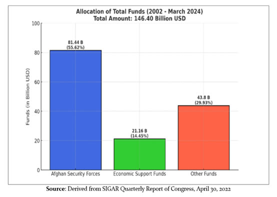 Furthermore, The Special Inspector General for Afghanistan Reconstruction (SIGAR) quarterly report dated April 30, 2022, states that the total amount appropriated for reconstruction efforts in Afghanistan from 2022 to March 2024 was US$146.40 billion. Out of this, US$81.44 billion was allocated to Afghan security forces, representing 55.62% of the total reconstruction funds, while US$21.16 billion was allocated to the Economic Support Fund, accounting for 14.45% of the total. This lack of prioritisation during a period of significantly available international resources and focus reflects NATO's disinterest in addressing Afghanistan's structural economic issues, which perpetuate its dependency on a ‘War Economy’. It would not be wrong to say that Afghan institutions failed to sustain themselves because a significant portion of US funds was directed toward military spending rather than critical infrastructure development, capacity building, and human resource development, as illustrated in the graph below.