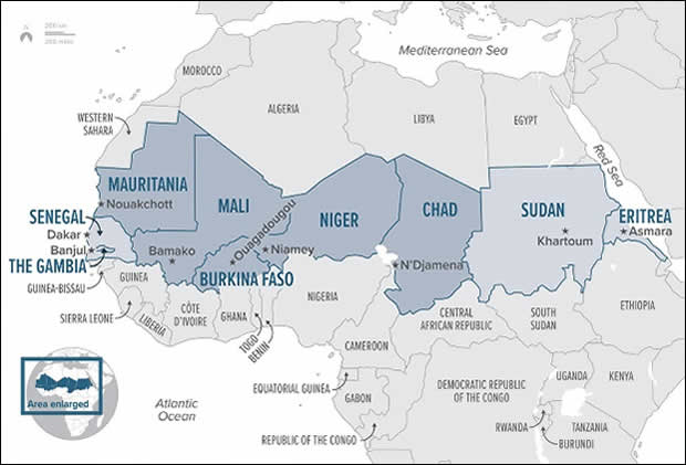 The Sahel is a semi-arid savannah belt stretching from the Sahara Desert to tropical Africa. It includes Mauritania, Senegal, Gambia, Mali, Burkina Faso, Niger, Nigeria, Chad, Sudan, Ethiopia, Eritrea, and Djibouti. The region has abundant natural resources and potential for rapid growth, but deep-rooted political, security, and socioeconomic issues affect the region's peace and stability.